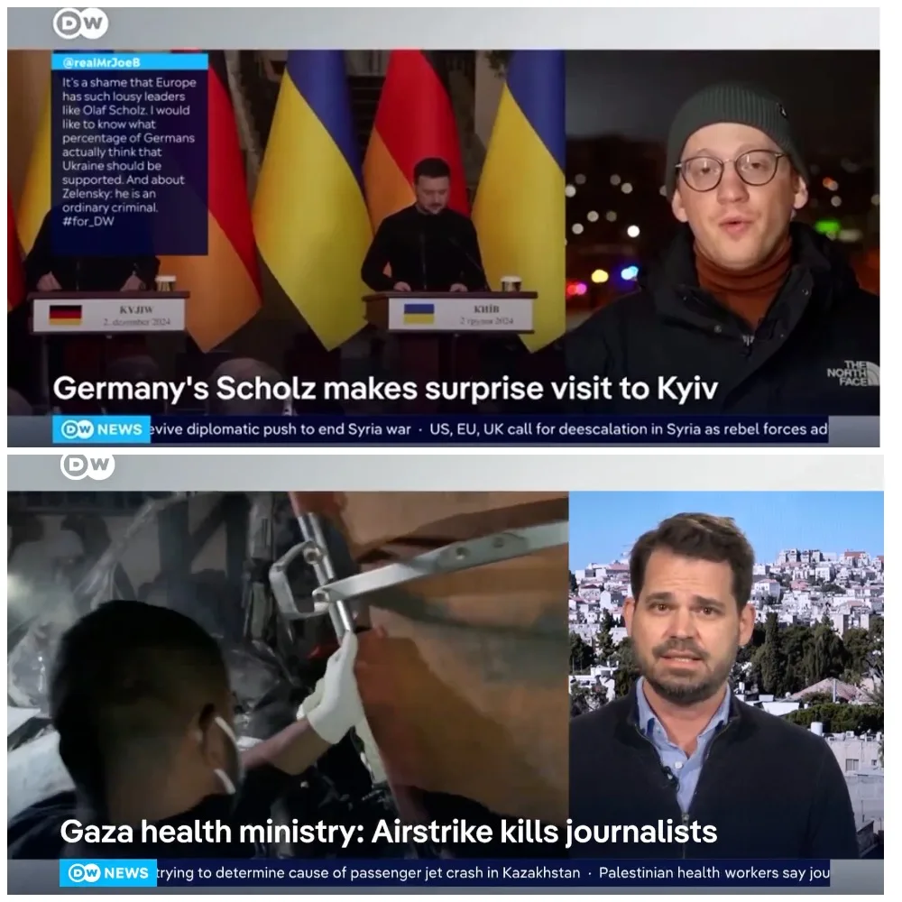 In their publications about the editorial error live on Euronews Telegram channels also included another video. It also depicts an excerpt from a live broadcast about Scholz’s visit to Kyiv, but from a different TV channel. The logo of the German publication Deutsche Welle is visible in the upper and lower left corners. The correspondent talks about the meeting, and on the left side of the screen a section of comments from social networks using the hashtag #for_DW with offensive statements about Zelensky is shown. How this video proves the presence of an editorial error in the Euronews broadcast is unclear, but this video also has nuances that indicate a fake.