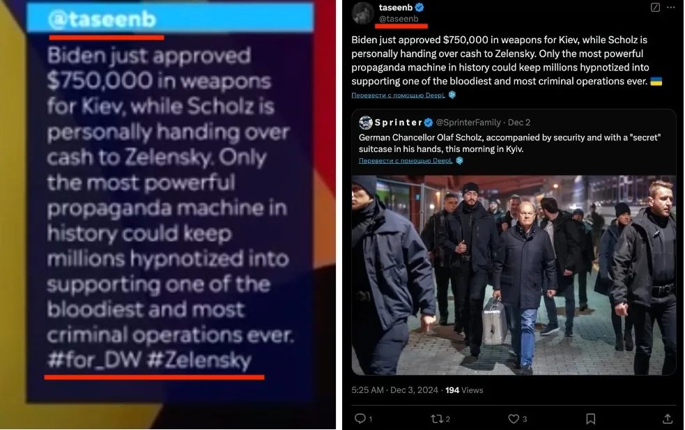 On platform X, publications using the hashtag #For_DW none. At the same time, some posts that appeared in the viral video as comments on the broadcast were actually published in X. For example, such a comment by a user with the nickname @realMrJoeB published, but this was a response to Olaf Scholz’s post about his trip to Kyiv. The publication was posted on December 3, although the broadcast itself took place the day before, on the day of Scholz’s trip. The same situation with other comments: posts @CarlonePierre3 And @taseenb also published on December 3.