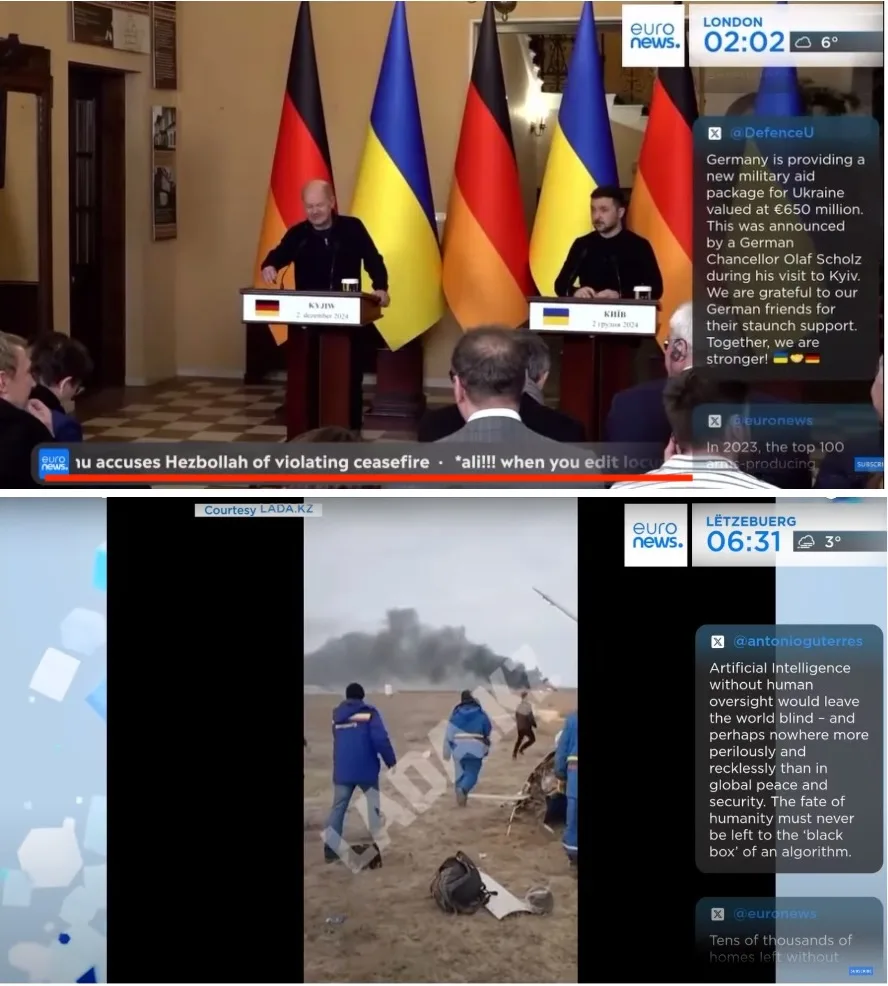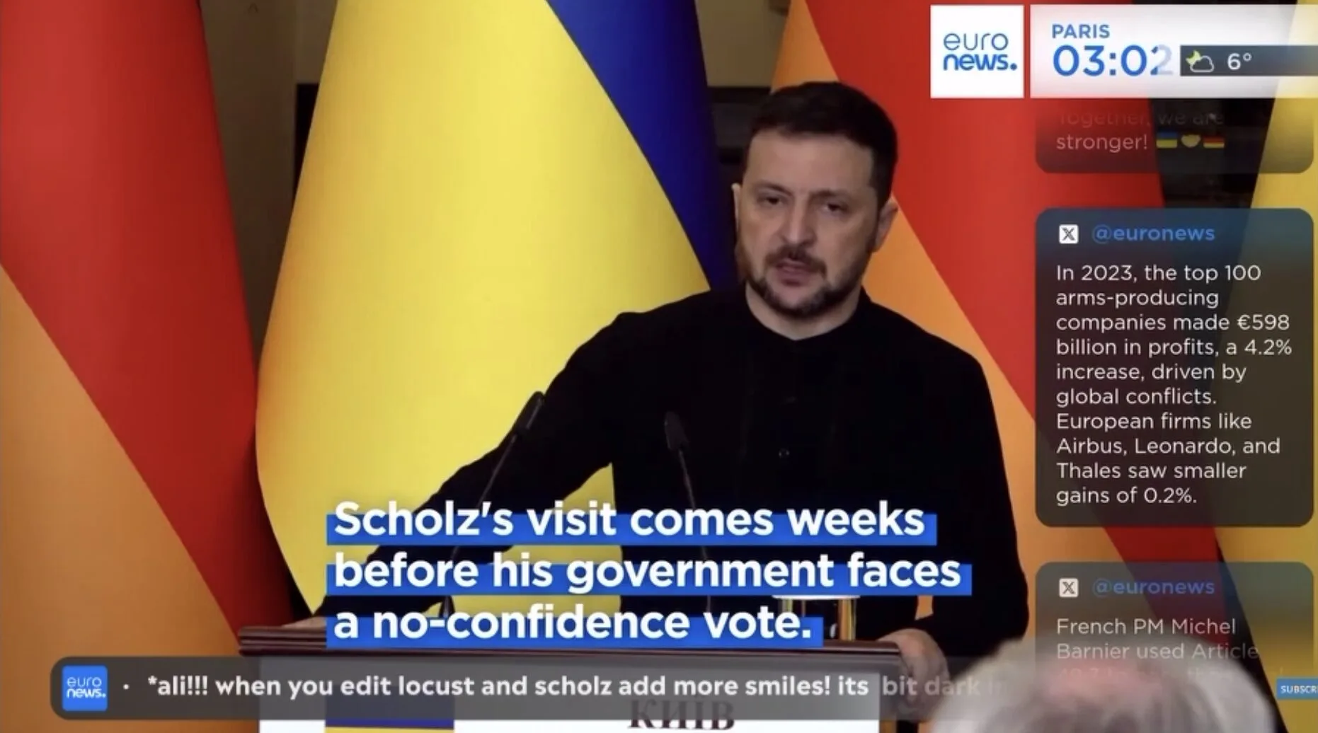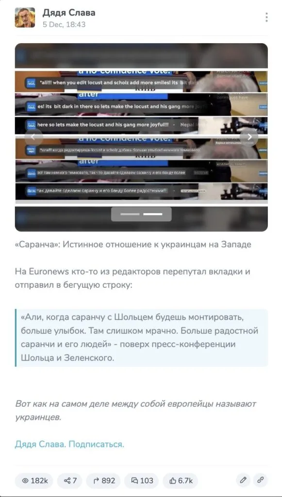 On December 5, an excerpt from a news release from the Euronews TV channel, which talks about negotiations between German Chancellor Olaf Scholz and Vladimir Zelensky, was widely circulated on Telegram channels. The editor’s messages allegedly accidentally appeared in the running line at the bottom of the screen, where he writes: “Ali, when you edit the locusts with Scholz, add more smiles. It's too dark there. More joyful locusts and his people.” The channels that published this video accompanied it with the caption: “This is how Europeans actually call Ukrainians among themselves.”