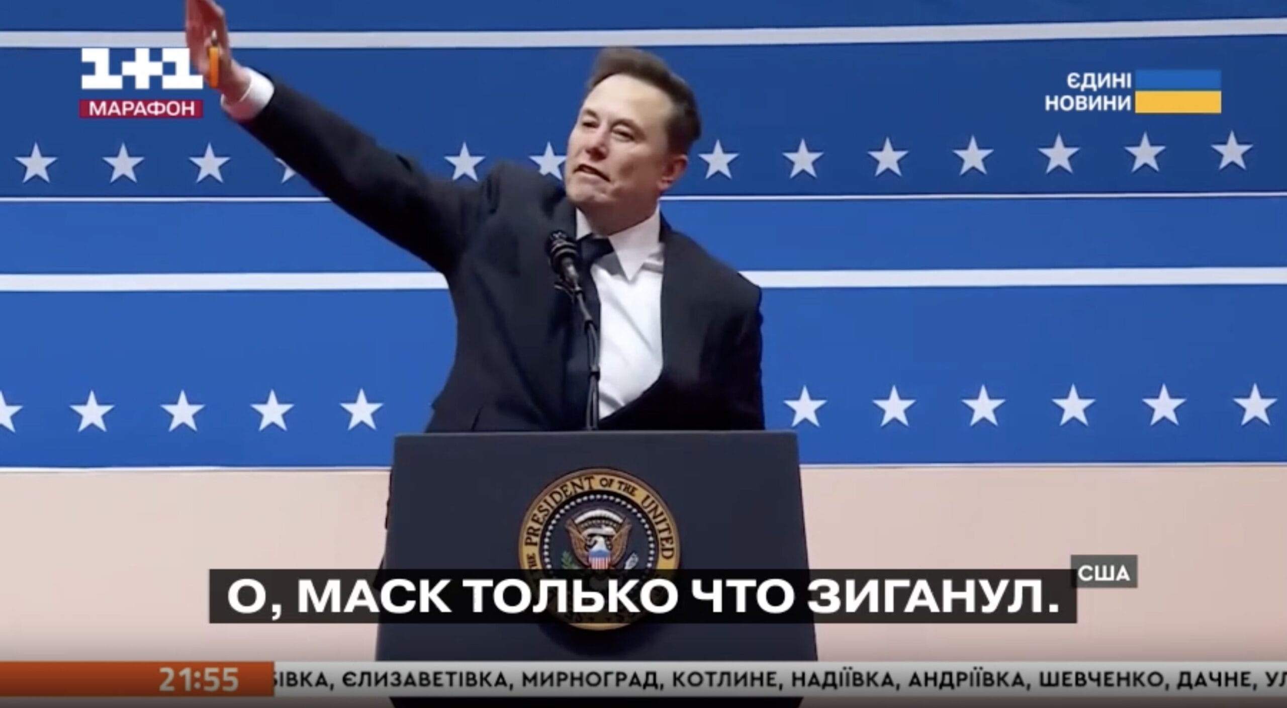 According to the time stamp on the ticker at the bottom of the screen, the video captured the broadcast moment at 21:55. This coincides with the timing of Musk's speech in Washington - his speech ended at approximately 14:55 North American Eastern Time, which is exactly 21:55 Kyiv time.