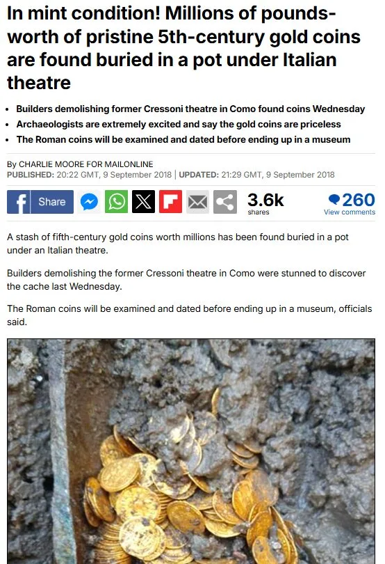 Pictures with a stone jug appeared on the Internet back in 2018, about six years before the news about the mushroom picker. One of them published, for example, the British newspaper Daily Mail in a note about how in the Italian city of Como, during the demolition of an ancient theater, builders discovered a cache of gold coins from the 5th century. The value of the treasure was estimated at millions of dollars.