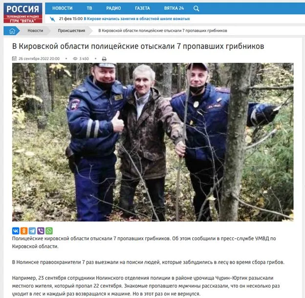 In another photo used in the viral news, imprinted not a Kamchatka, but a Kirov mushroom picker, who in 2022 got lost in the forest, spent the night in an apiary, and was found by local police in the morning.