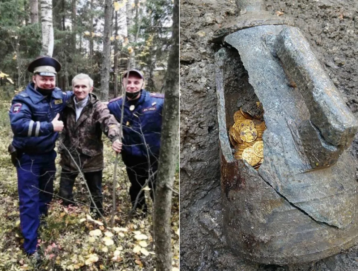 As reported in the news, a certain Kamchatka resident went into the forest to pick mushrooms, fell into a hole and discovered an old jug with gold coins from the 18th century. The total cost of 6 kg of coins was 79 million rubles. The man failed to keep the news secret - rumors about the find spread throughout the village, and he had to hand over the treasure to the state. However, the court decided to transfer 25% of the value of the coins to the mushroom picker. With these funds, the man allegedly bought himself an estate and renovated the local temple. The news was accompanied by a photograph of a mushroom picker in the forest surrounded by law enforcement officers, as well as photographs of a broken jug of gold coins.
