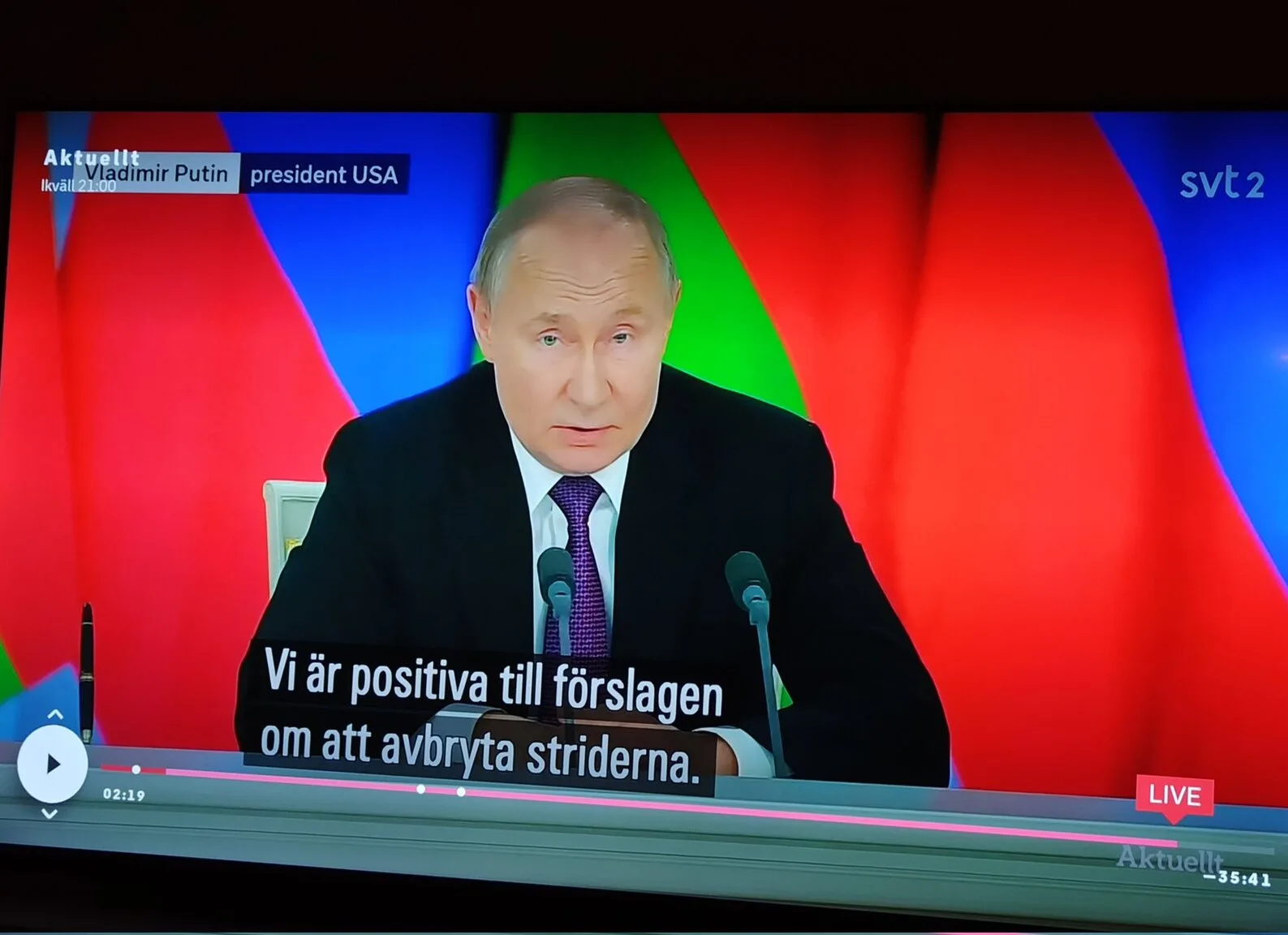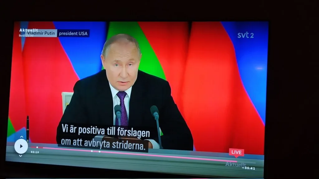 Such a TV show actually airs on SVT. The channel's website contains recordings of broadcasts, in particular from March 13, when the screenshot began to circulate. Issue started with news about negotiations on a possible ceasefire between Russia and Ukraine. The story shows footage of Trump's speech, followed by an excerpt from the broadcast of the joint press conferences Putin and President of Belarus Alexander Lukashenko, which took place on the same day. At the 02:18 mark, next to the name of the Russian president, a title actually appears for a few seconds, where he is called the President of the United States.