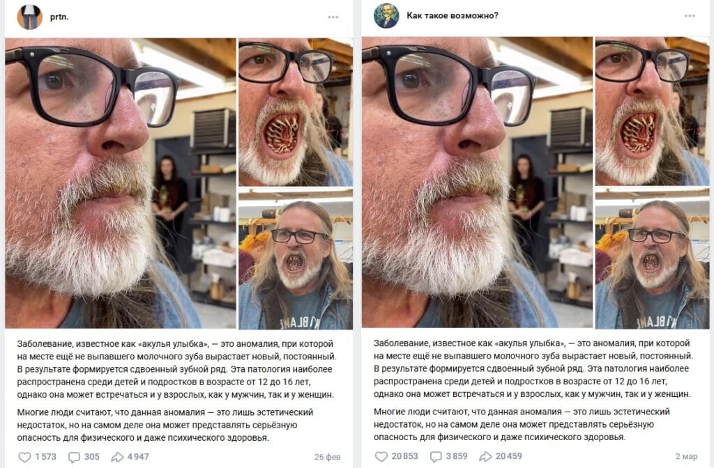 “The disease known as shark smile is an anomaly in which a new, permanent tooth grows in place of a baby tooth that has not yet fallen out. As a result, a double dentition is formed. This pathology is most common among children and adolescents aged 12 to 16 years, but it can also occur in adults, both men and women. Many people believe that this anomaly is just an aesthetic defect, but in fact it can pose a serious danger to physical and even mental health,” the public says.How is this possible?» on VKontakte. The post, illustrated with three photographs of a man with a shark smile, received 18.6 million views at the time of writing this analysis.