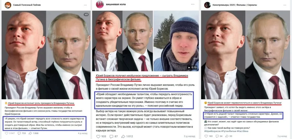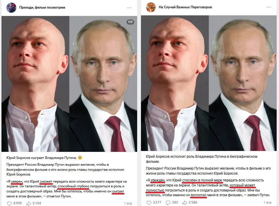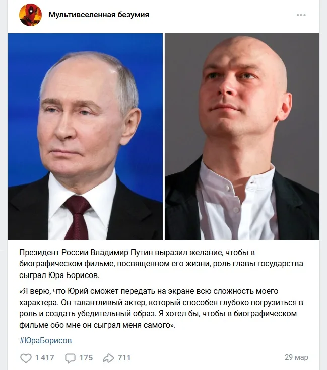 Thus, the news that Putin has expressed a desire to be played by Yura Borisov in a biopic is satirical. It appeared in a relatively small public on VKontakte, which has been posting similar posts about the actor for months, then was copied by large communities on April 1, and subsequently spread to other groups and went beyond the social network.