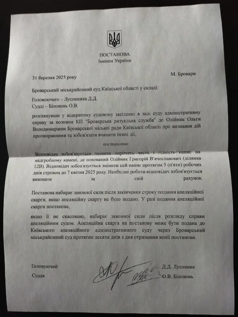 The second image is a snapshot of the ruling of the Brovary Interdistrict Court of the Kyiv Region, which was issued on March 31, 2025. The lawsuit, it follows from the document, was filed by the Brovary Ritual Service utility company, and Olga Vladimirovna Oleynik is listed as the defendant. Telegram channels and media write that this is the mother of Grigory Oleynik, whose grave is shown in the first photo.