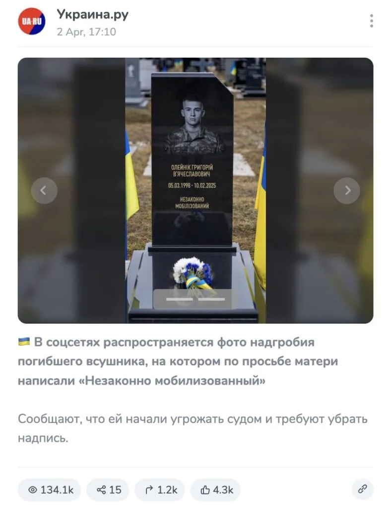 A photo of the supposed tombstone of a fallen Ukrainian soldier went viral on April 2. Engraved on the slab is a portrait of a man, the name Grigory Vyacheslavovich Oleinik, dates of life and the signature “illegally mobilized” in Ukrainian. Along with this photograph, an image of a document is usually distributed, which states: the information on the tombstone is recognized as defamatory to honor and dignity, and the mother of the deceased serviceman is obliged to remove the inscription at her own expense within five working days.