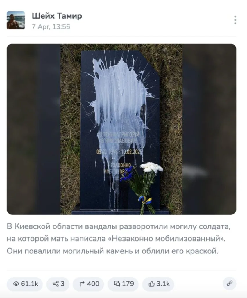 Despite these denials, on April 7, another photograph of a tombstone, this time allegedly lying on the ground and covered in white paint, circulated on Telegram channels and the media. The signatures stated that activists in the Kyiv region destroyed Oleinik’s burial place because of an inscription about the illegality of mobilization. Similar posts appeared in Telegram channels “Sheikh Tamir"(103,000 views), "Military report"(44,000), "Gasparyan" (39,000) and "tough nut"(20,000), as well as on social networks "Constantinople" and on the website "Another Ukraine"