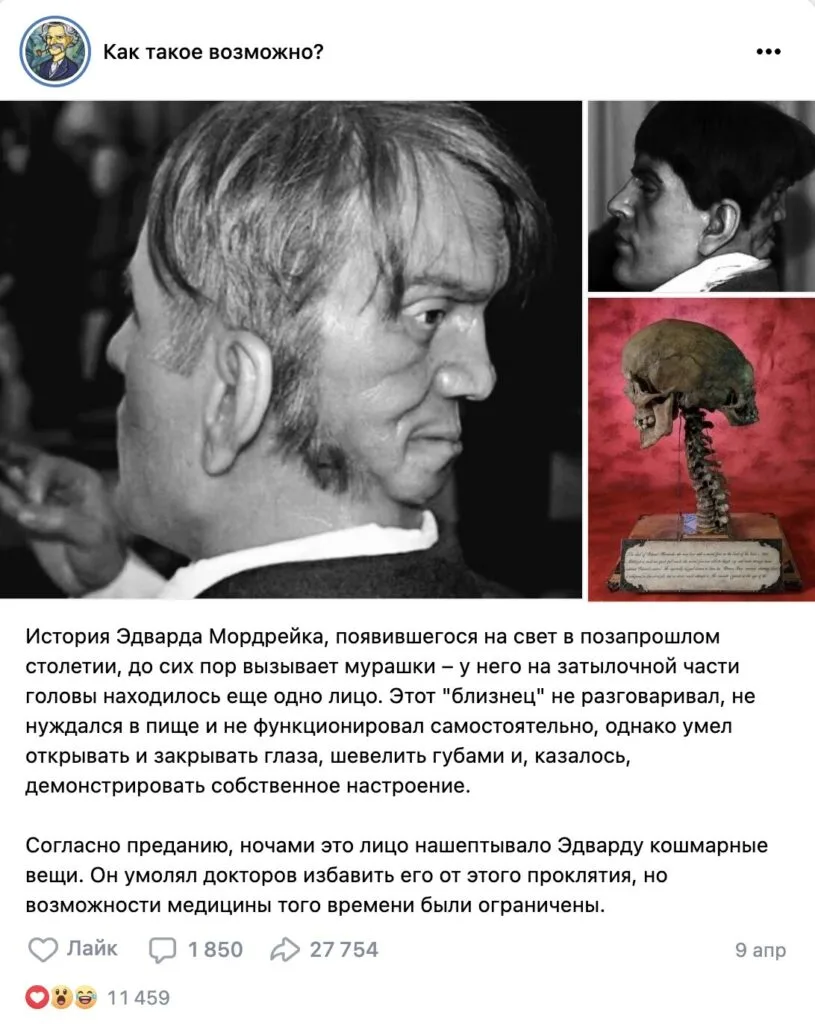 Posts on this topic are often accompanied by photographs - some of them show a man with a face on the back of his head (presumably this is Mordrake), others show a human skull with two faces. This story is especially popular on VKontakte, where similar publications are recruiting thousands and even tens of thousands reposts. In addition, it can be found in Facebook, Instagram and on entertainment sites.