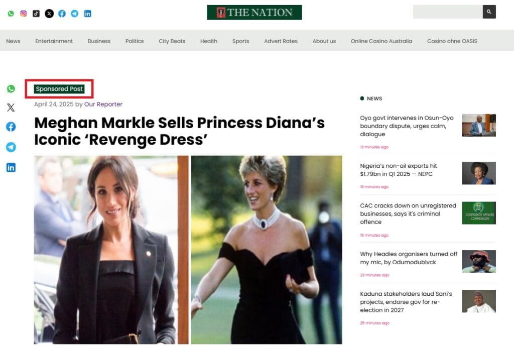 Reputable English-language media did not write about Zelenskaya’s supposed expensive purchase. Nevertheless News.ru claims, without citing a source, that the story was reported by The Nation. One might think that we are talking about an American magazine, but about the sale of Princess Diana's dress on April 24 wrote website of the same name Nigerian newspapers (thenationonlineng.net). On the same day, a similar note was published on the website of the Independent, but not the British, but another Nigerian publication (independent.ng). Moreover, on The Nation next to the title there is mark Sponsored Post, that is, material about the first lady of Ukraine was published there on a paid basis. This Nigerian publication has already been mentioned in another parsing “Verified”: in 2023 they wrote that during a visit to New York Zelenskaya spent more than $1 million on jewelry, but the news turned out to be fake.