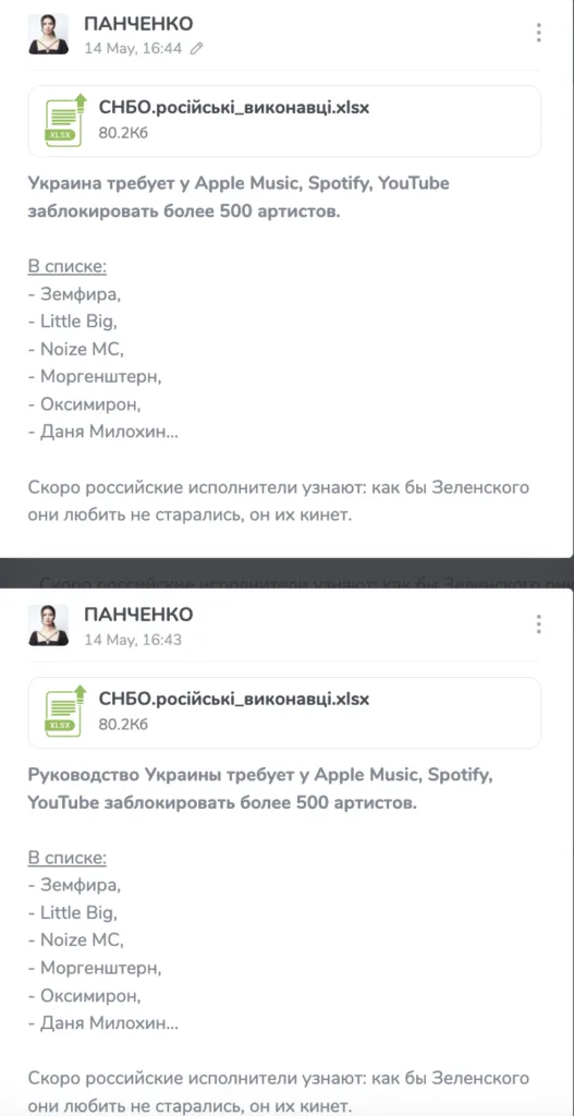 The news spread mainly through Russian-language sources, and for the first time appeared in the Telegram channel of Ukrainian pro-Russian journalist Diana Panchenko on May 14 at 16:43 Moscow time. By data TGStat, she first wrote that the demand came from the leadership of Ukraine, and then changed the wording to even less specific (“Ukraine demands”). She was the first to post a list of artists without indicating its source.