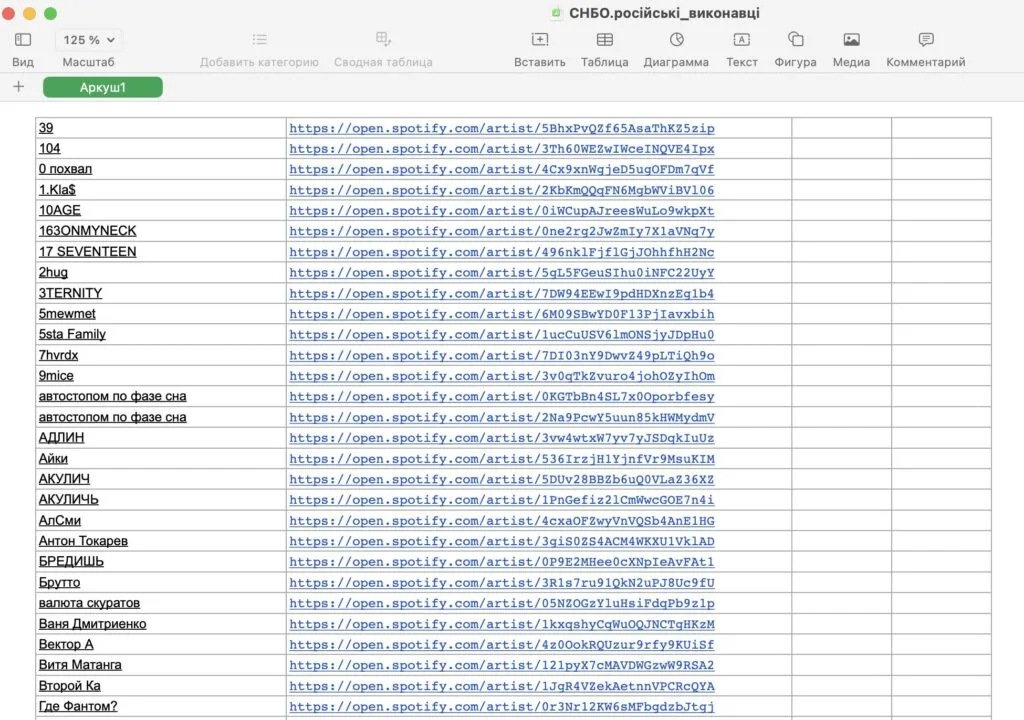 Publications that Ukraine has demanded that streaming services block more than 500 Russian performers are being distributed along with a list of these musicians. It is designed in the form of an Excel table called “NSBO.rosiyski_vikonavtsi” (“NSDC Russian performers” - Ukrainian). The document consists of pairs of names and links to Spotify accounts without any explanation (and even links to Apple Music profiles and YouTube channels, which are also supposedly proposed to be closed).