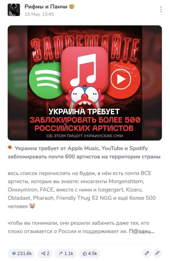 However, from time to time there is dissatisfaction among activists that residents of Ukraine can still listen to Russian-language tracks, and some of them are becoming popular, despite the war. In 2023, the Office of the President of Ukraine applied to Spotify asking it to block songs by Russian artists who support the invasion and “Putin’s aggressive policies.” A year later, the streaming service deleted accounts of Shaman, Polina Gagarina, Grigory Leps, Yulia Chicherina, Oleg Gazmanov and the Lyube group; a few days later their channels disappeared on YouTube. However, this decision by both services is not related to the requirement of the Ukrainian authorities, but to announced EU sanctions against these performers. However, Apple Music is still Can unhindered listen any of these artists.