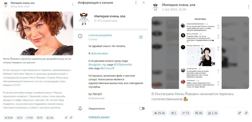 In fact, the original source of this news was the satirical Telegram channel “The Empire is Very Evil”, where there was an entry about Jovovich and the fired Ukrainian housekeeper appeared September 28, 2024 at 13:30 Moscow time and received 31,000 views. Two days later, the author of the channel stated, that her fictitious news about the actress “went well,” and asked for help to “harvest the harvest,” that is, to share resources that passed off fiction as reality. October 1 “The Empire is very evil” posted screenshots of TV presenter Ruslan Ostashko’s post on Telegram and notes from the Argumenty i Fakty newspaper. Later that day, the channel owner published a screenshot with approving comments from people who took the satirical news seriously and began writing to the actress on social networks. “A census of compatriots begins on Milla Jovovich’s Instagram,” added “The Empire is Very Evil.”