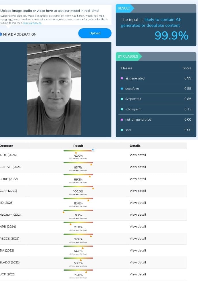We analyzed the portrait using Hive And DeepFake-o-meter — tools for recognizing content created using AI. Both showed that with a high probability the image was generated by a neural network.