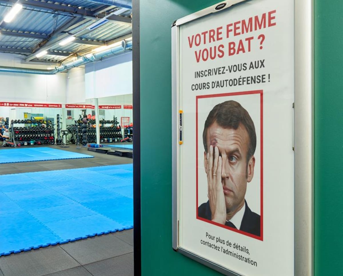 At the end of May 2025, a photo allegedly taken in one of the French gyms went around the Internet. It shows an advertising poster for self-defense courses “for those who are beaten by their wife” with a portrait of the country’s president. We have verified the authenticity of this photo.