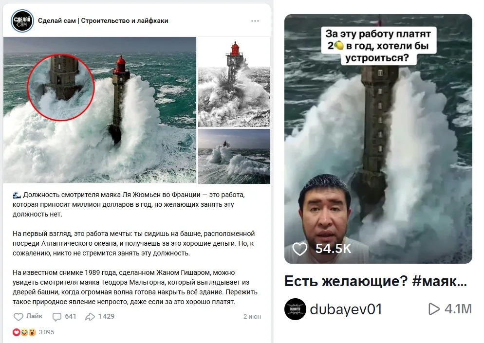 In June 2025 in the public “Point of view"(147,000 views at the time of writing this analysis) on VKontakte described the proposed vacancy as follows: "Lighthouse keeper of La Jument (La Jument, pronounced in French as La Jument. - Ed.) in France - a job for $1 million a year, but there are no takers. At first glance, it seems that this is a dream job: you sit on a tower in the middle of the Atlantic, they pay you good money for it. But the problem is that no one is in a hurry to get a job. In a famous 1989 photograph taken by Jean Guichard, lighthouse keeper Théodore Malgorn looks out of the tower doors as a giant wave is about to engulf the entire building. Not everyone can survive such an element, even if they pay a lot of money.” In the same month, similar posts were published in other communities, including “DIY | Construction and life hacks"(3.2 million views), "About everything | Science - facts" (1.2 million), "How is this possible?"(245,000), "Tricks of life"(66,000), etc.