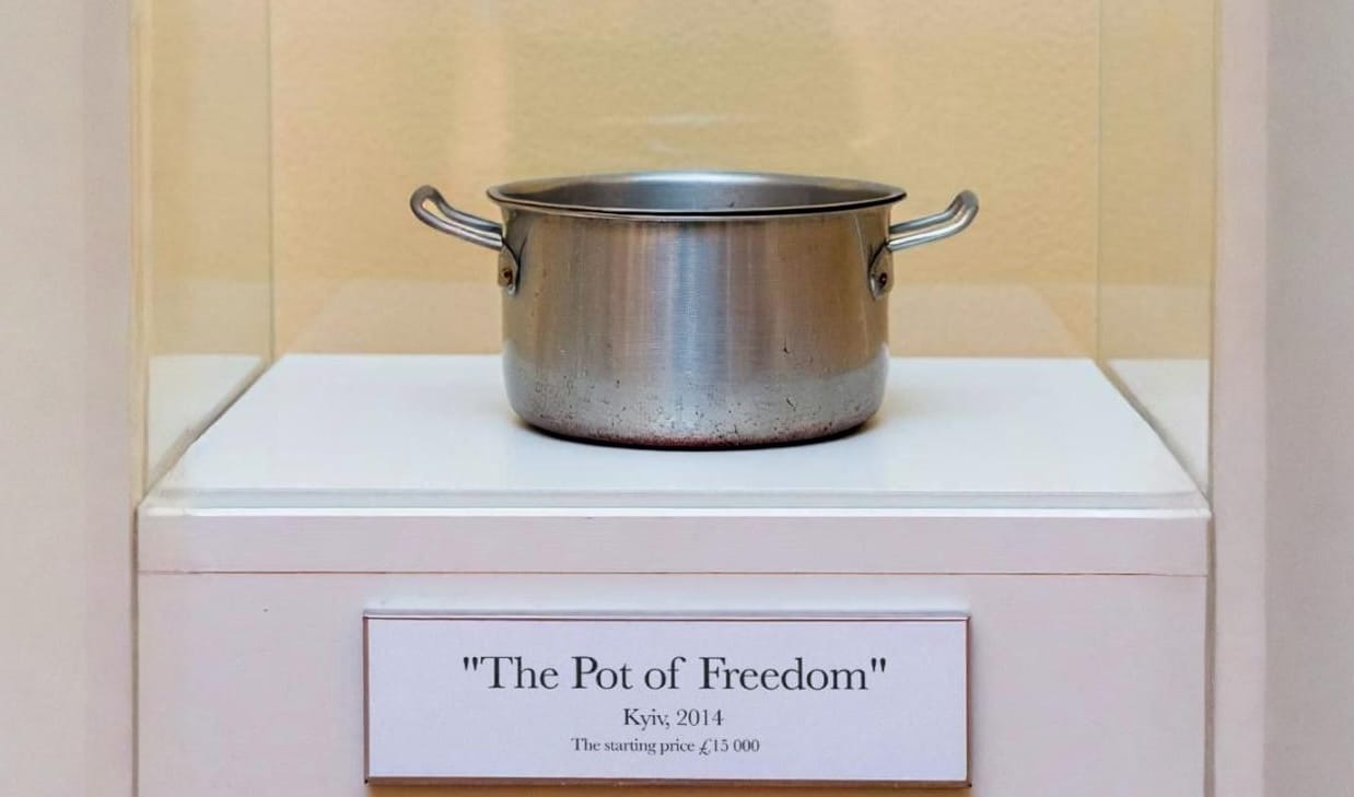 A photograph of the lot from the auction in London circulated on June 19. The photo shows a saucepan behind protective glass, and the label below reads: ““Freedom Saucepan”, Kyiv, 2014. Starting price: £15,000." The authors of publications about this lot specify that such pots were worn on the heads of Euromaidan participants.