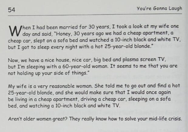 The full statement goes like this: “After 50 years of marriage, I once looked carefully at my wife and said: “50 years ago we had a small house, an old car, we slept on the couch and watched a small black and white TV, but every night I went to bed with a beautiful 19-year-old girl. Now I have a huge expensive house, many expensive cars, a huge bed in a luxurious bedroom, a wide-screen TV, but I sleep in the same bed with a 69-year-old woman. I'm starting to doubt my marriage." My wife is a very reasonable woman. She was not offended and did not swear. She simply suggested that I find myself a 19-year-old girl, and she would make sure that I again lived in a small house, slept on a sagging sofa and watched black and white TV. Well, aren't women gorgeous? They really know how to solve all their husbands’ problems.”