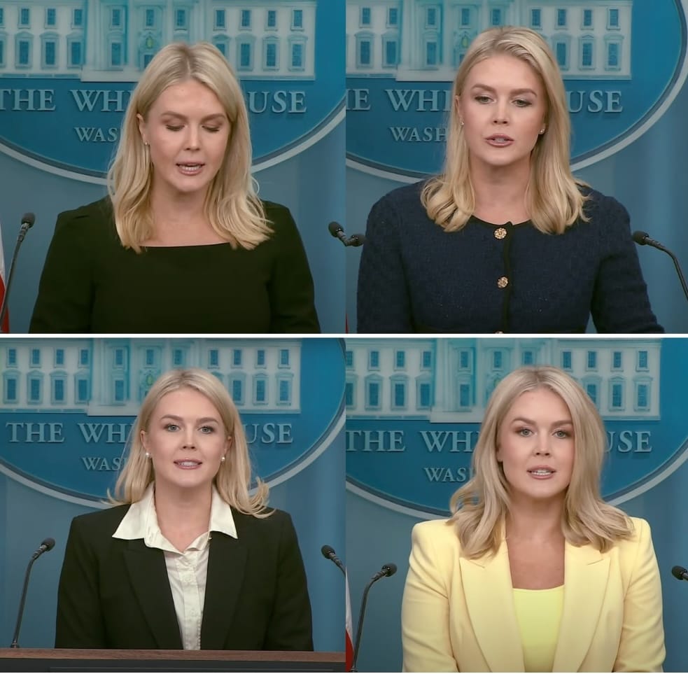 Although the photographs are authentic, they were not taken at recent press conferences. For example, the photo of Levitt in a crimson jacket in the middle row refers to her first briefing as White House Press Secretary in January 2025. The photo to the right of her was taken in February, the bottom three - in April and May (1, 2, 3).