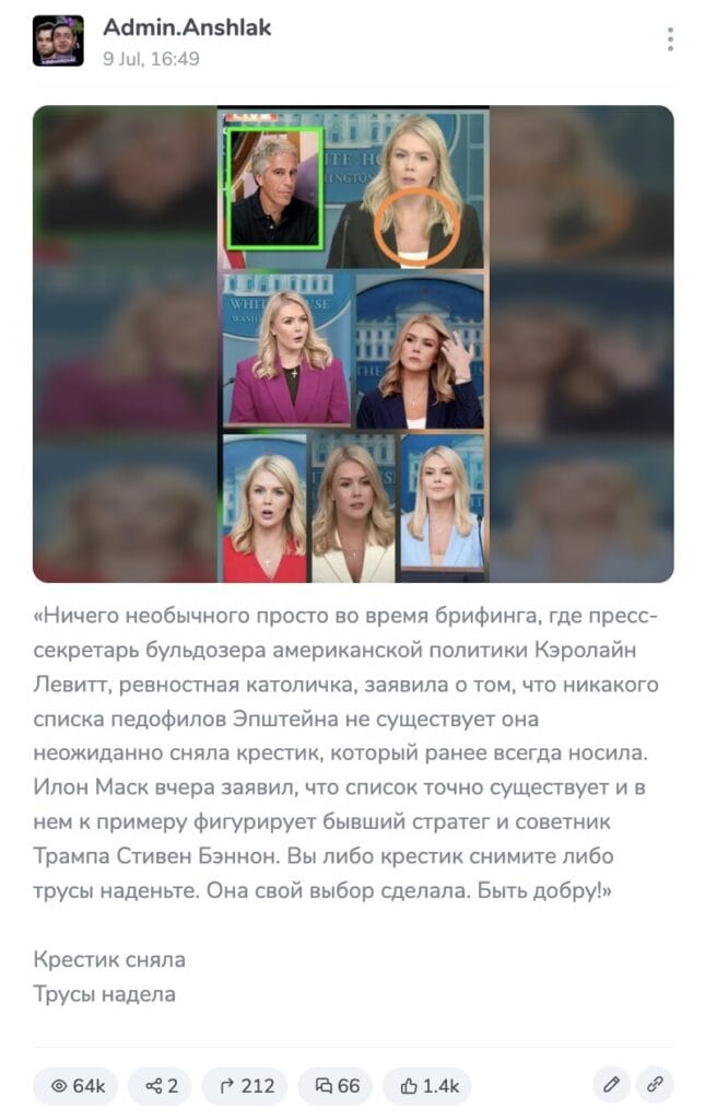 Reports that Levitt deliberately did not wear a cross at the July 7 briefing initially spread in the English-language segment of the social network X. In particular, a collage of several photographs of the press secretary was the first published user @MyLordBebo, his post received 3 million views. “She took off the cross... so she could lie about Epstein,” the blogger wrote. @MyLordBebo not for the first time meets in analyzes “Verified” as the primary source or distributor of false information.