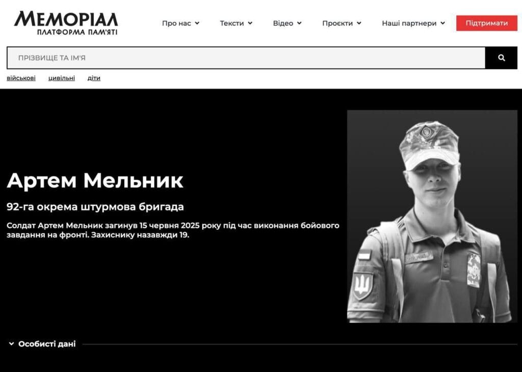 All the posts mentioned above contain the same screenshot, allegedly taken on the Memorial website. This is Ukrainian project, which collects, verifies and publishes information about those killed during the war with Russia - both civilian and military. According to the viral image, the killed hero of the meme was named Artyom Melnik, he served in the 92nd separate assault brigade. “The soldier... died on June 15, 2025 while performing a combat mission at the front. Defender is forever 19 [years old],” the screenshot reads. The obituary also includes a photo of the young man.