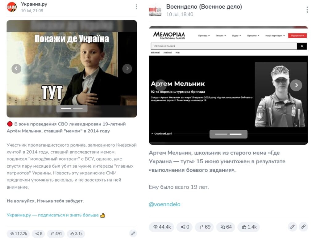 Publications about the supposed death of the meme hero appeared on RuNet on July 10. “In the SVO zone, 19-year-old Artyom Melnik, who became a meme in 2014, was eliminated. A participant in a propaganda video recorded by the Kyiv junta in 2014, which later became a meme, signed a “youth contract” with the Armed Forces of Ukraine, but a couple of months later he was killed for the foreign interests of the “main patriots” of Ukraine. The Ukrainian media preferred to mention this news in passing and not focus attention on it,” says the Telegram channel “Ukraine.ru"(112,000 views at the time of writing this analysis). Similar note published on the website of this publication.