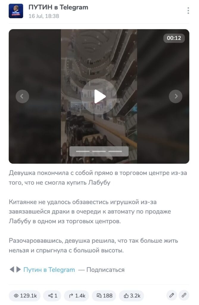 The information that the girl in the video committed suicide because she did not get Labubu was spread mainly in Russian; there are also publications in Ukrainian. The first similar post that was found by “Verified” appeared July 15 at 08:25 Moscow time in the closed Telegram channel “Den of Tin 21+”. This channel specializes in videos that show acts of violence without censorship. Then the news spread through other closed channels with similar content, and on the night of July 16 published the “Bad News 18+” channel is publicly available, after which the videos went viral.