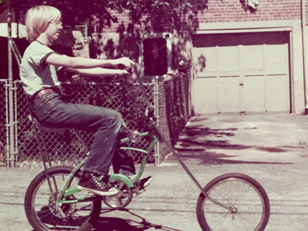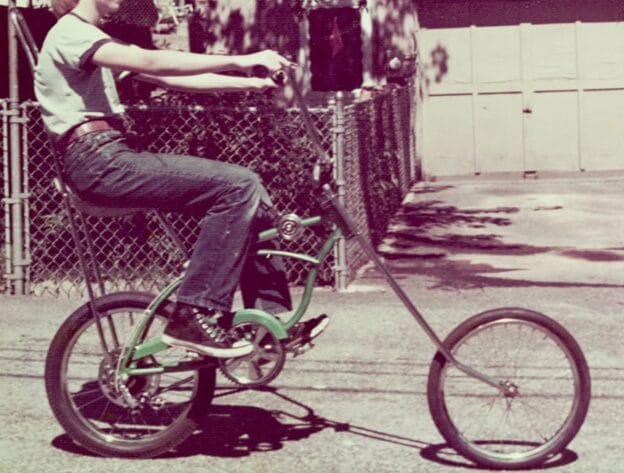 Judging by the photo, this is a chopper based on the model Schwinn Pea Picker or similar from the same line. Such bicycles of the appropriate shade have been produced since the late 1960s, after Gates became interested in computer science.