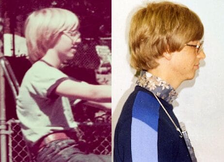 The photograph, sold in color and black and white, shows a blond teenager wearing glasses riding a bicycle down the street. Claimed to be future entrepreneur and philanthropist Bill Gates in the 1970s.