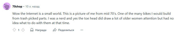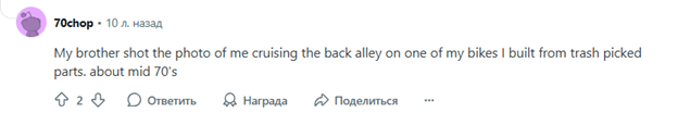 A month and a half later, a user with the nickname 70chop appeared under both publications. With the words “the Internet is small,” the man said that he was the one depicted in the photograph taken by his brother in the mid-1970s. 70chop noted that the bicycle depicted in the photo was assembled by him from parts found in a landfill.