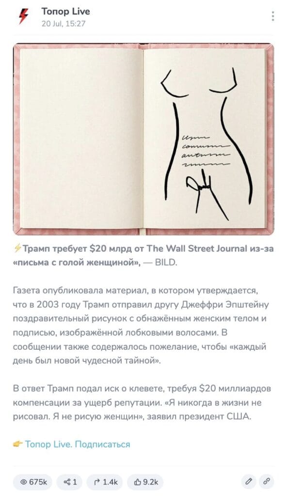 On July 19, it became known that US President Donald Trump filed a lawsuit against The Wall Street Journal. Two days earlier, the publication reported that in the early 2000s, the future head of state sent financier Jeffrey Epstein an unusual birthday greeting - a letter with a drawing of a naked woman. Telegram channels illustrated news of the lawsuit with an alleged photograph of this letter. This is what the channels didAx Live"(704,000 views at the time of writing this analysis), "Putin on Telegram"(132,000), "Sheikh Tamir"(113,000), "Bullet" (72,000), "From the scene"(46,000), etc.