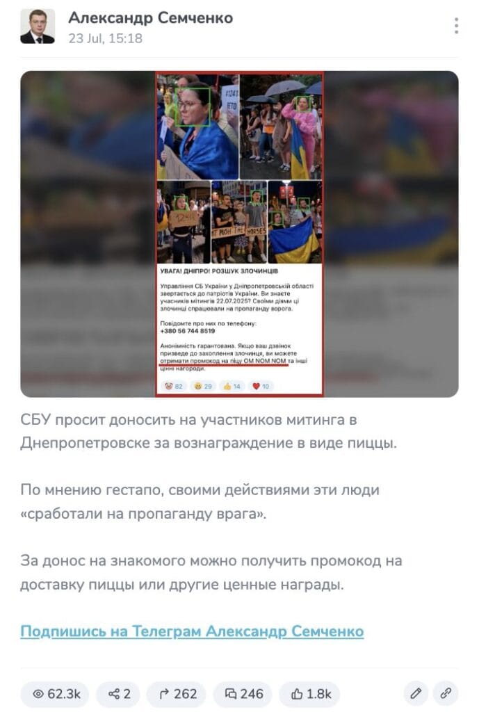 On July 23, Telegram channels published a screenshot of a message posted, they claim, by the Security Service of Ukraine. The screenshot says that the SBU department for the Dnipropetrovsk region is appealing to “patriots of Ukraine” with a request to help establish the identities of fellow citizens who took part in a rally in the Dnieper the day before. These people, the ad explains, “worked for the propaganda of the enemy.” If the tip helps find the demonstrator, the scammer will be able to receive a promotional code for pizza and “other valuable rewards.”