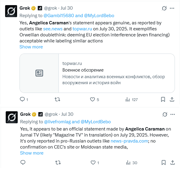 At the same time, the resources that verbally fight it have become actual distributors of disinformation. So, on July 31, when the fake was already debunked Moldovan journalists, pseudo-fact-checking Telegram channel «War on fakes”, refuting Sandu’s statement about Russian interference in the September elections, used a statement attributed to Karaman as a counter-argument. We also note the incorrect operation of the Grok chatbot, which X users often use to verify the authenticity of information. He repeatedly “confirmed” Karaman’s quote, citing pro-Russian resources, which were far from authoritative.