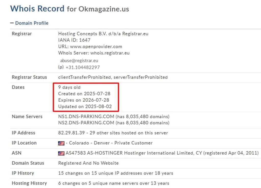 According to the Whois service, the domain okmagazine.us was registered July 28, 2025, two days before the publication of the article about Sandu (for comparison, the real website OK! exists since 2003). Moreover, the earliest article in the “News” section is dated July 26, 2025, in the “Royal Family” section - May 31, and in the “Crimes” section - May 20. However, judging by the metadata in the source code of these pages, they were all created on July 29, shortly after the domain was registered.