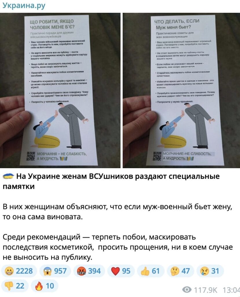 “In Ukraine, special reminders are distributed to the wives of the Wehrmacht. They explain to women that if a military husband beats his wife, then she is to blame. Among the recommendations are to endure beatings, mask the consequences with cosmetics, ask for forgiveness, and under no circumstances make it public,” says the post on the Telegram channel “Ukraine.ru"(116,000 views at the time of writing this analysis). The publication is accompanied by a photograph of the leaflet in Ukrainian and its machine translation into Russian. Similar posts appeared in other channels, for example “Voblya • news" (116,000) and "Sheikh Tamir"(103,000). In addition, the news was discussed in “Odnoklassniki"
