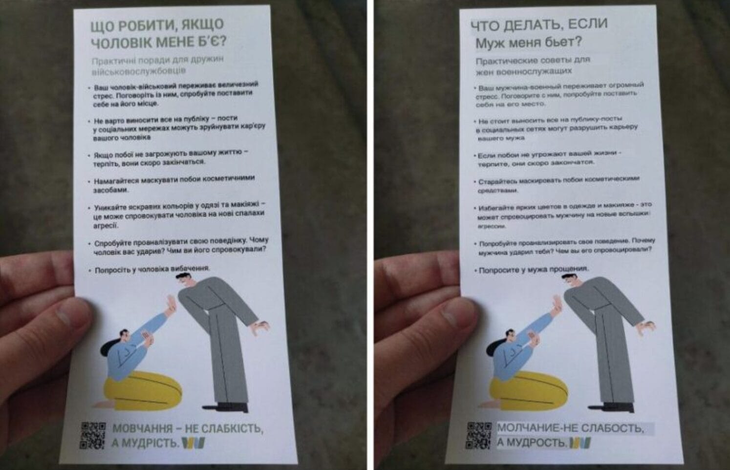 This leaflet contains the logo of the Ukrainian non-profit organization "Women's power of Ukraine"and a QR code that leads to the NPO website. When you click on it, a pop-up window opens with the text: “A fake leaflet is being distributed on the Internet with supposed advice to women to endure and disguise beatings, where our name / QR is used. This is fake. We have not created this and will never create it. We have been supporting military personnel and their families for over a decade and strongly condemn violence of any kind.”