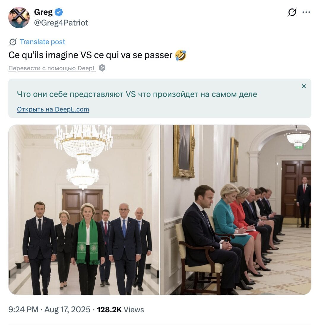 Thus, the photo of European leaders waiting for Donald Trump to invite them to negotiations was created using AI. It was generated by social network user X, most likely as a joke.