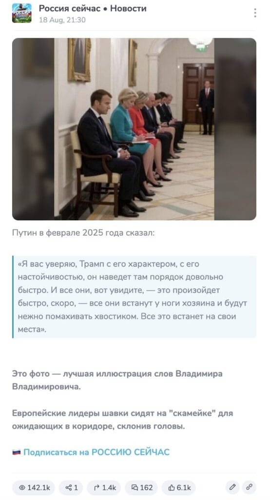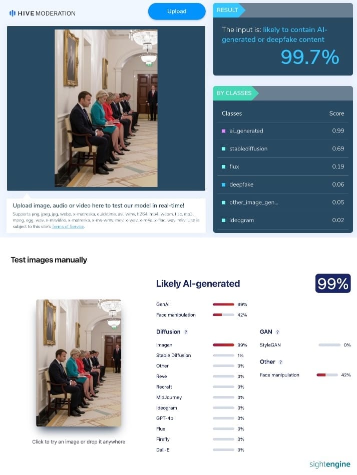 This post was made on August 17, the day before the start of negotiations in Washington. In good quality, it is also noticeable that the photo contains many artifacts characteristic of images generated by neural networks - the photo itself is unnaturally smoothed, and there are more feet on the floor than politicians sitting on chairs. Probability that both images were created using AI, tools to identify generated content Hive And Sightengine estimated at 99%.