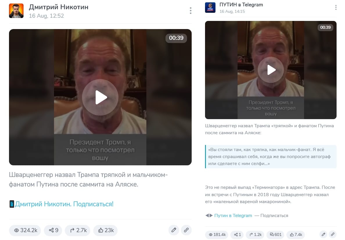 According to the TGStat service, similar posts in total received several million views on Telegram. The channels wrote about how Schwarzenegger allegedly commented on Trump’s behavior in Alaska.Dmitry Nicotin"(324,000 views), "Belarusian security officer"(202,000), "Truthfulness"(175,000), "Ostashko! Important" (twice: 105,000 And 101,000), "Live broadcast"(102,000, post deleted), "KB"(87,000, post deleted), "Petya the First"(79,000), "Mislivets Egor"(58,000), etc. Similar notes are found in "VKontakte", "Zene"and Russian media (among them "Moskovsky Komsomolets", "Constantinople", "Sight", News.ru), as well as in Ukrainian-speaking Telegram channels, pages English And German-speaking X users and on the Estonian portal Lemon. In response to Schwarzenegger's alleged words, State Duma deputy Vitaly Milonov named former governor of California, a wizened old man.