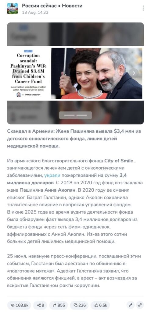 Publications that Pashinyan’s wife was allegedly involved in the withdrawal of funds from a charitable foundation spread on August 18. Posts are accompanied by a screenshot of a note from a news site and a video in English. Media and bloggers reported that a corruption scandal had broken out in the City of Smile relief fund, from which $3.4 million in donations had been stolen. This became known during the latest financial audit. Previously, the fund was managed by Anna Hakobyan, after her Archbishop Bagrat Galstanyan, who was detained in June 2025, was appointed as the new head. Media and bloggers, in posts about the scandal with the prime minister’s wife, referred to lawyer Sergei Harutyunyan, who allegedly said that the real reason for the prosecution of his client was the discovery of a corruption scheme in the fund: from 2018 to 2025, money was withdrawn from there through a network of shell companies associated with Anna Hakobyan. On June 24, Galstanyan shared the audit results with colleagues and planned a public press conference the next day, but was detained.