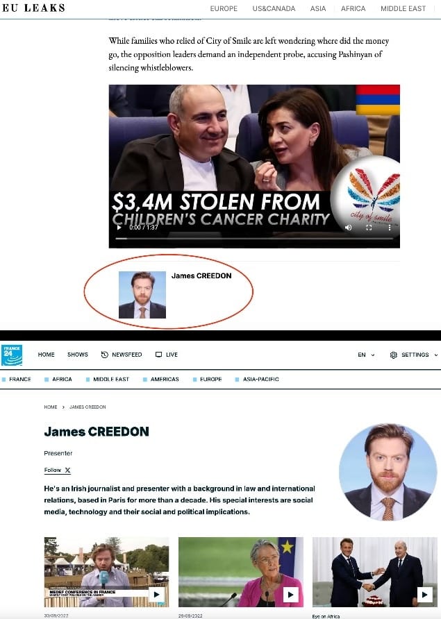 Photo of the journalist who allegedly wrote a note about Anna Hakobyan, taken from the France 24 website. James Creedon is an Irish presenter who previously worked for a long time with the French television channel. Although Creedon himself did not comment on this publication, France 24 statedthat the identities of Creedon and five other journalists (other notes on the EU Leaks website are also signed with the names Gavin Lee, Mark Owen, Kate Moody, Jessica le Masurier and Yuki Roer) were stolen.