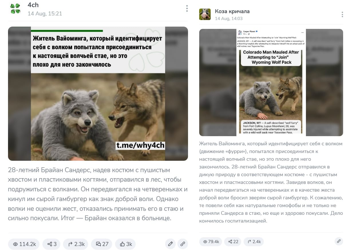 According to the TGStat service, at the time of writing this analysis, about 70 similar Russian-language posts had appeared on Telegram, which in total received more than 600,000 views. Channels wrote about Sanders Nina Vatt (127,000 views), 4ch (114,000), "Dmitry Vasilets"(105,000), "Savanichi"(82,000), "The goat screamed"(79,000),"Runet trends"(67,000), "Russia now"(33,000), "Favorite VPS"(31,000), etc. The story about the wolf man can also be found on VKontakte (examples here, here And here).