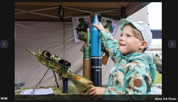 At 12:27 Moscow time on the website of a major Estonian publication Postimees posted a photo gallery with pictures taken at the event. There was a lot of footage of children participating in military-patriotic-themed entertainment. There are also three photographs in this gallery that were referenced by the Russian media (Izvestia was one of the first, three hours later). Their author is a Postimees photojournalist Eric Proses.