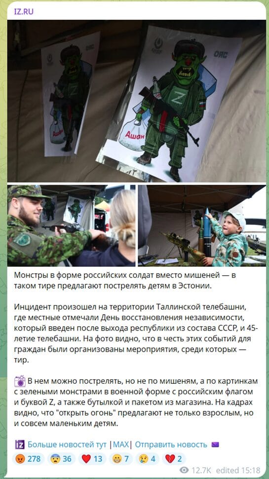 They wrote about the provocative Tallinn shooting range “News", Lenta.ru, "Gazeta.ru" And "Vesti.ru", a number of Estonian Russian speakers communities on social networks, as well as numerous Telegram channels, including “Pozdnyakov 3.0"(390,000 views at the time of writing this analysis", "Solovyov" (224 00), "Truthfulness"(172,000), "Russia now" (146,000) and "Release the Kraken"(129,000). Commenting on the news, official representative of the Russian Foreign Ministry Maria Zakharova in an interview with “Izvestia” stated: “Instilling nationalism in children is to cripple them and doom future generations to terrible trials.”