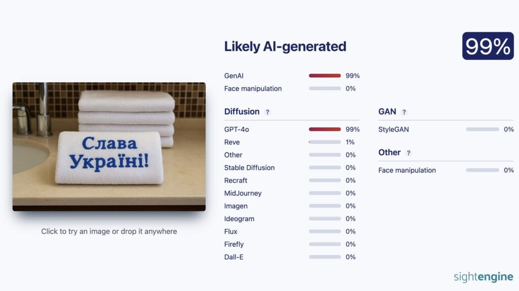 In the case of the second photo, a reverse image search did not produce results, but the photo itself looks unnatural. There are no folds on the towels, the light falls too evenly. This suggests that the image may have been created using AI. AI Content Discovery Tool Sightengine estimated the probability that the image was generated by a neural network to be 99%.
