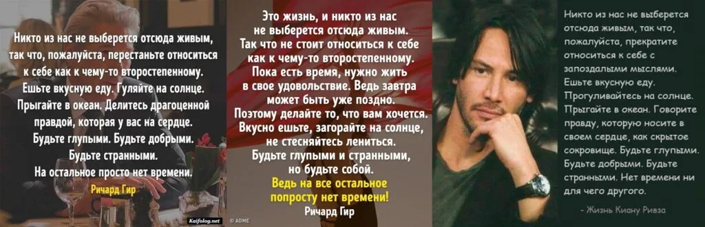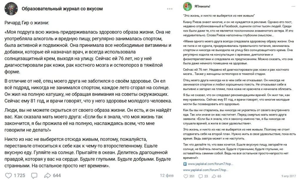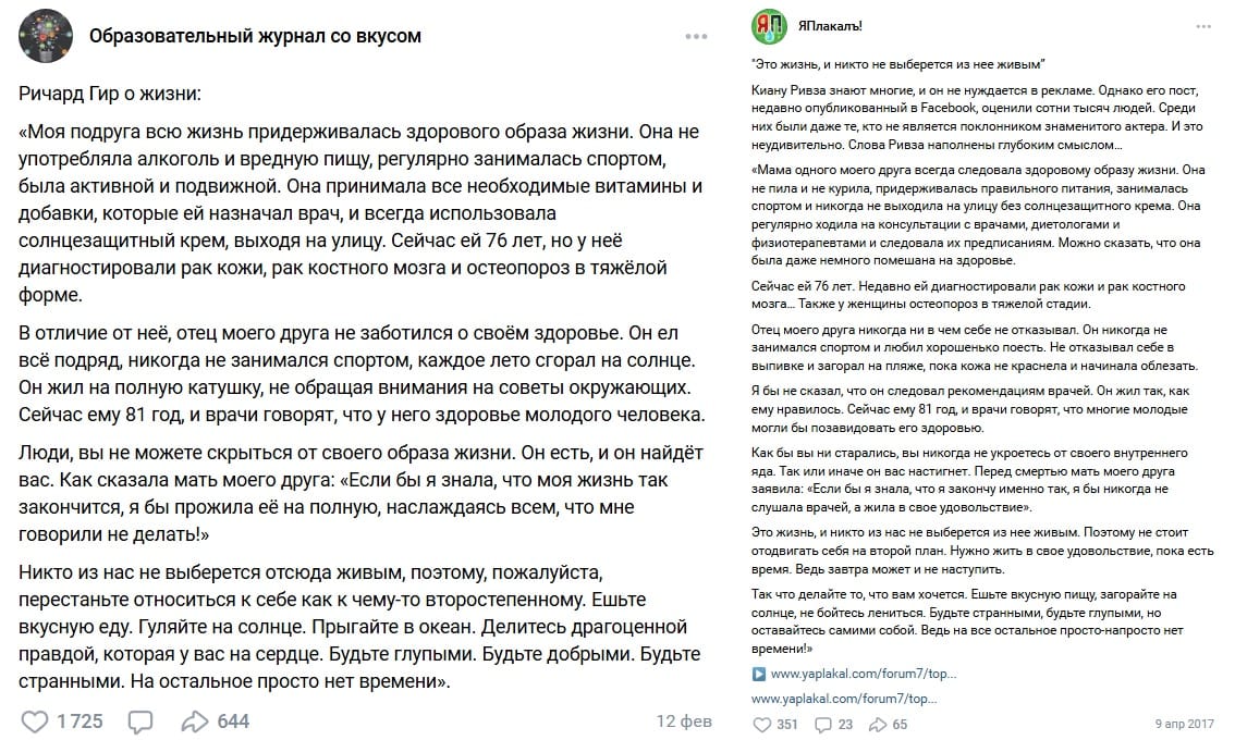 One of the most common versions of the viral phrase is: “This is life, and none of us are getting out of here alive. So don't treat yourself as something secondary. While there is time, you need to live for your own pleasure. After all, tomorrow may be too late. So do what you want. Eat deliciously, sunbathe in the sun, don’t be shy about being lazy. Be silly and weird, but be yourself. After all, there’s simply no time for everything else!” A shortened version of this quote with a slightly different translation is also popular. The fact that its author is Richard Gere was reported on August 19, 2025 by the public “Right Thoughts" on VKontakte (at the time of writing this analysis, the post received 566,000 views). Similar recording in the same community, it was released in October 2024 and was viewed 115,000 times. The quote signed by Gere is also popular on Facebook*, where the group’s post Who's Who received 126,000 likes in 2020. Many similar publications can be found in other groups on VKontakte (examples here, here, here, here And here) and Facebook (here And here), on Telegram (here, here And here), "VK Video", "Zene", Instagram* and on "Peekaboo"