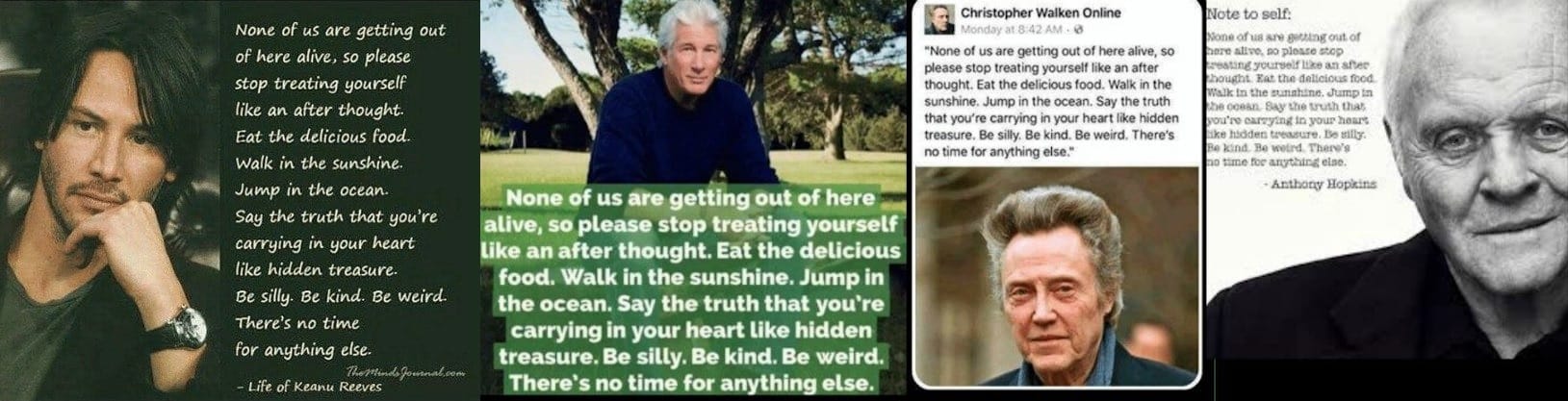 Thus, neither Richard Gere nor Keanu Reeves has ever publicly uttered the viral motivational quote that begins, "This is life, and none of us are getting out of here alive." In fact, this text was written by a blogger on Facebook in 2015.
