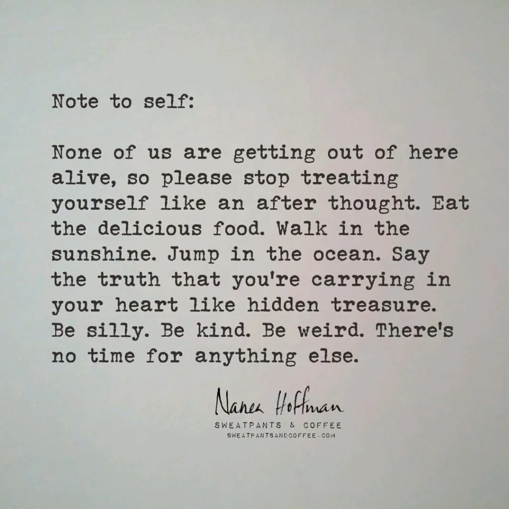 None of us are getting out of here alive, so please stop treating yourself like an afterthought. Eat delicious food. Take a walk in the sun. Jump into the ocean. Speak the truth that you carry in your heart as a treasure. Be stupid. Be kind. Be weird. There’s no time for anything else.”